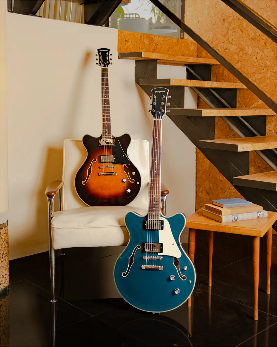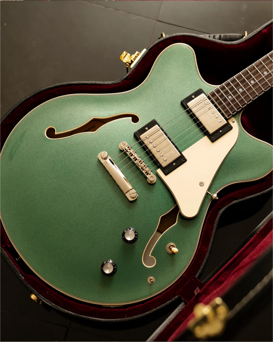 • Comfort-first design: A modern semi-hollow electric guitar with chambered construction, solid carved top, and deep belly cut