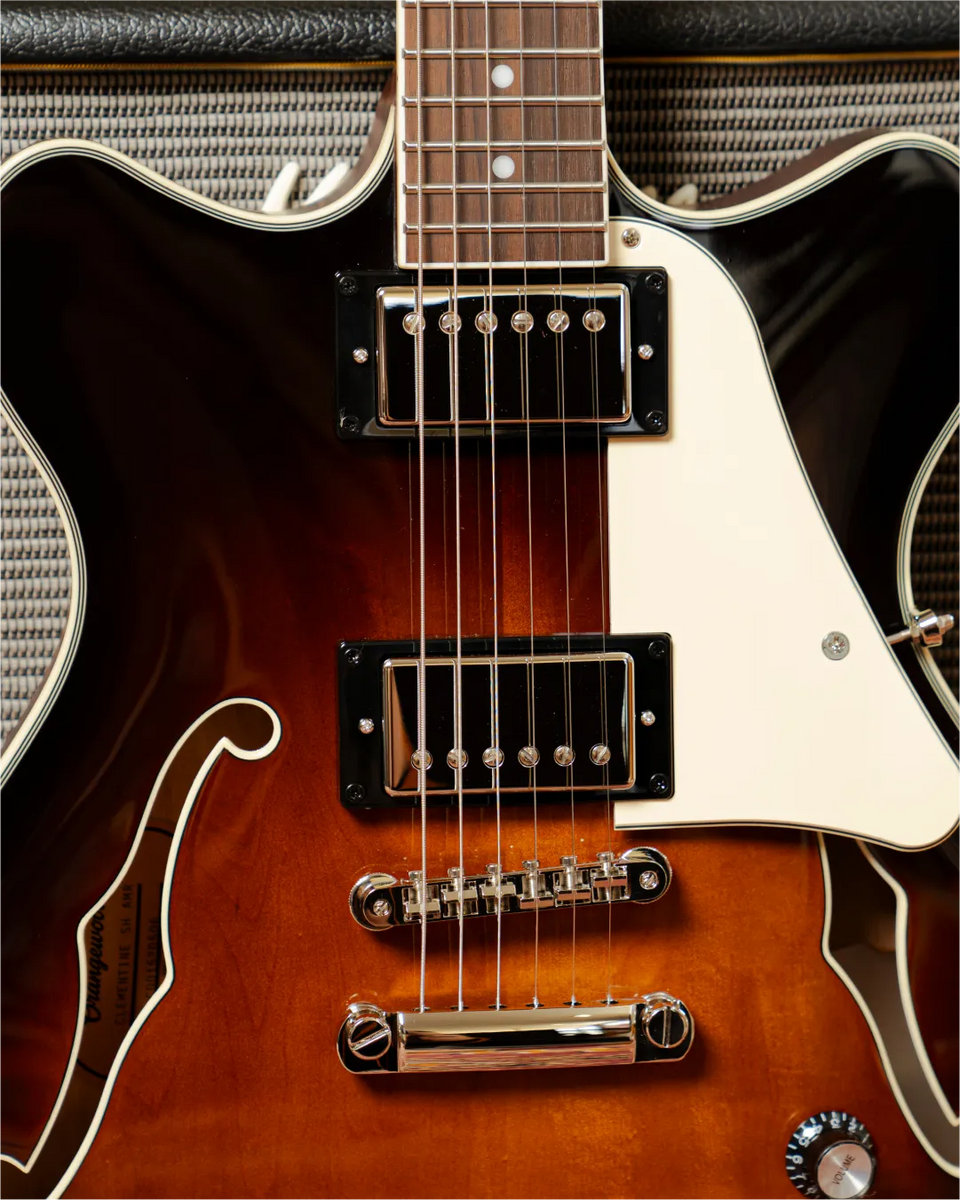 Ergonomically designed, the mid-size chambered body with a solid carved top and contoured belly sits naturally and resonates beautifully. Grover locking tuners, a Tune-O-Matic bridge, and an easy-access backplate make this modern semi-hollow effortless to play and maintain.
