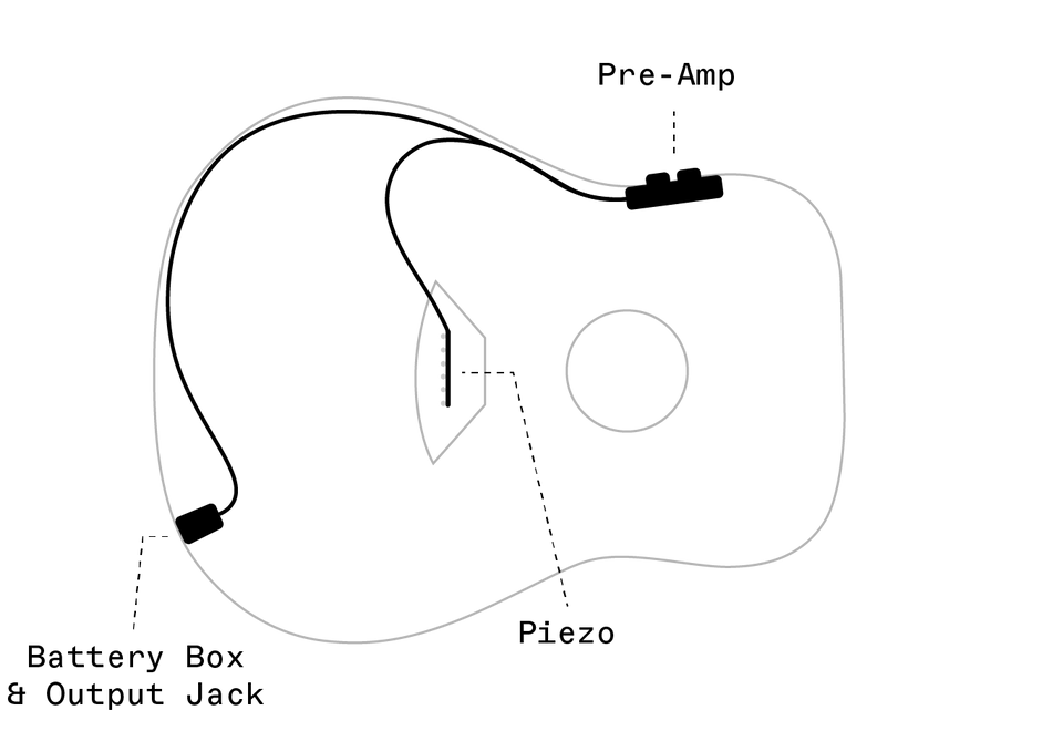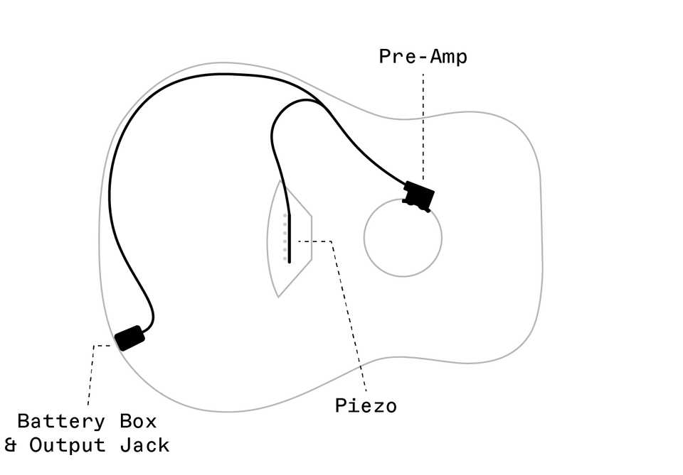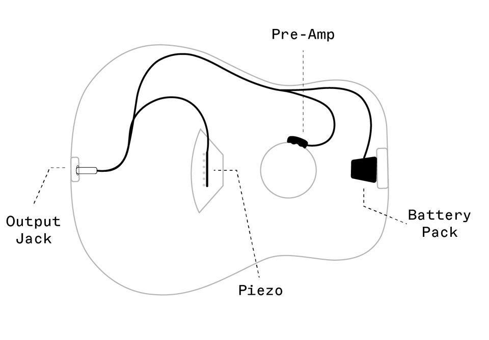 A basic undersaddle piezo pickup system that creates a bright, articulate, and responsive sound with two controls: volume and tone. Available on Overland Collection models.