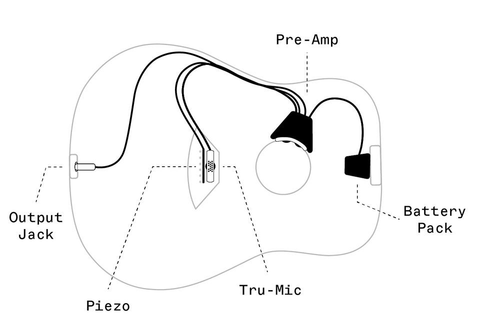 All-in-one pickup system that combines an onboard microphone and undersaddle piezo to create a natural, studio-quality acoustic sound. Available on our Topanga Collection and Highland Collection models.
