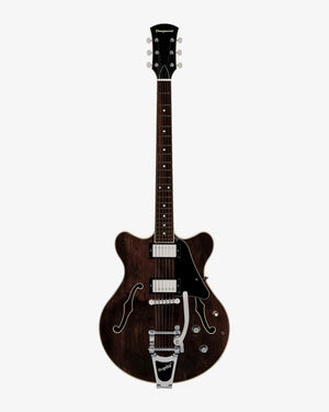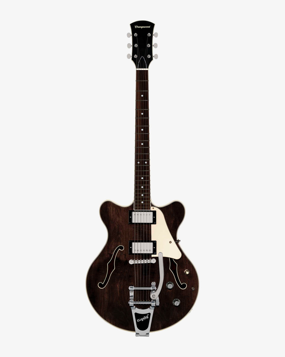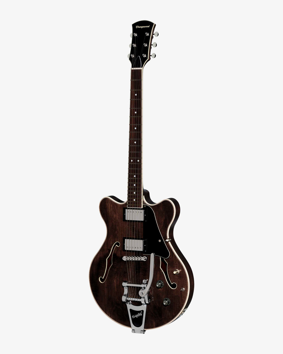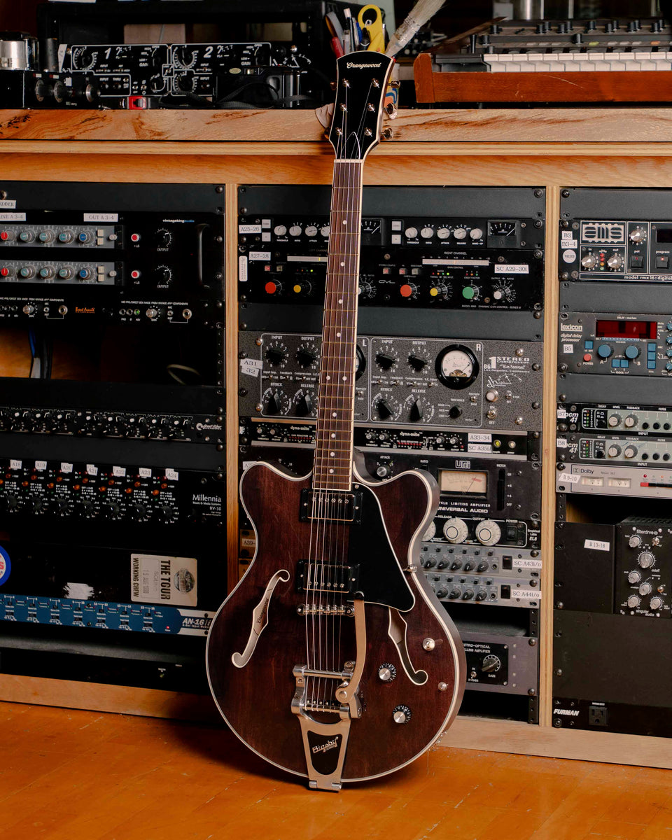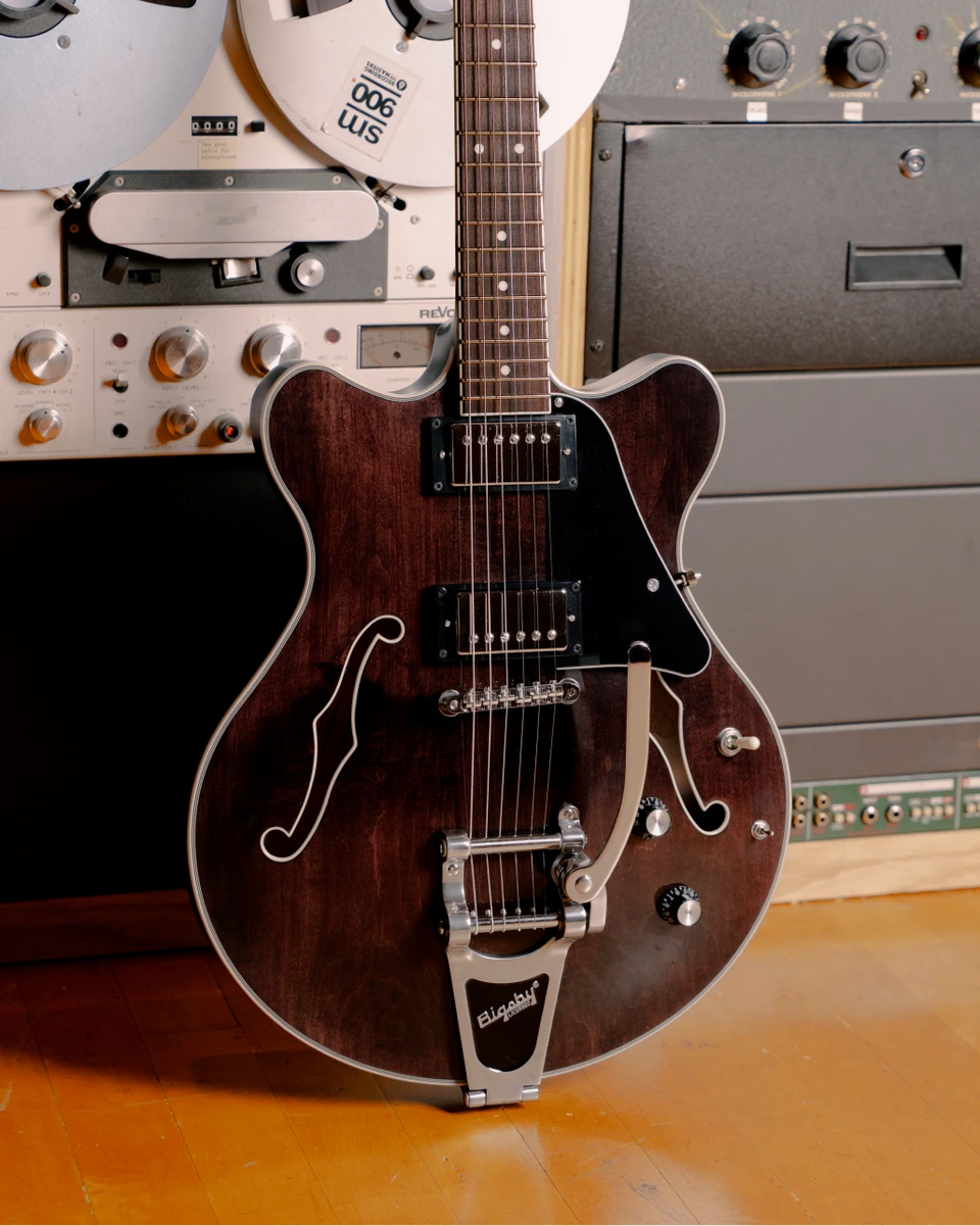 Adding a Bigsby tailpiece brings expressive vibrato to Clementine’s comfort-focused design. A double-cutaway chambered body, solid maple carved top, and contoured belly cut create a smooth, ergonomic feel. Slightly smaller than a traditional semi-hollow guitar, Clementine sits perfectly without sacrificing sustain or resonance.